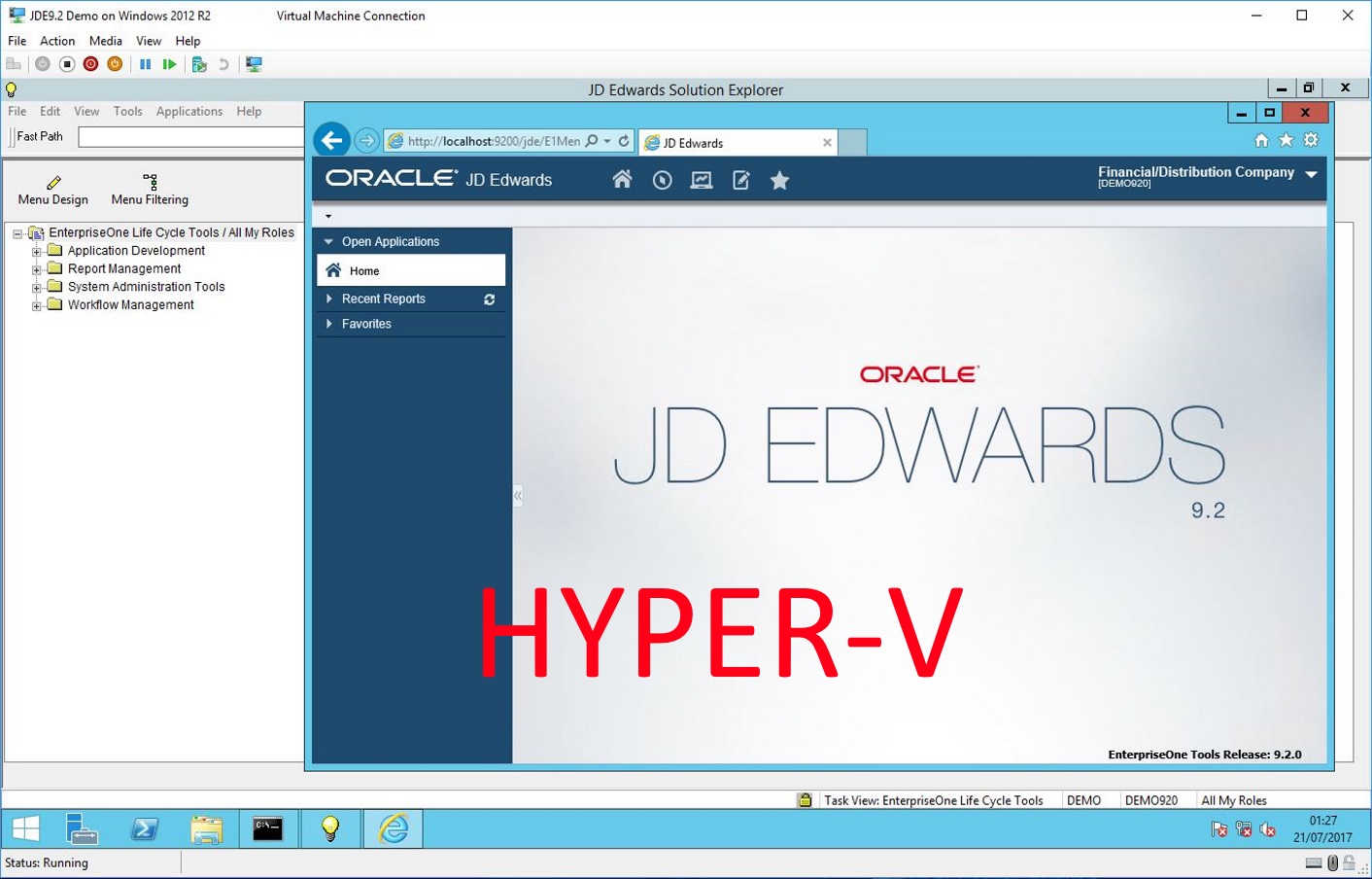 The 9.20 Demo is based on an Oracle 12C server (this was supplied with the JDE Standalone demo) installed on an evaluation copy of Windows 2012 R2. (180 day expiry) The VM can be supplied in either Microsoft Hyper-V format (vhd) or VMWare (vmdk). Each disk file expands to around 37Gb from a 13.5Gb zip file. (and from this you can extend volumes as you see fit) Please note - only the harddisk file is supplied - you will need to know how to import this harddisk into your working environment. This is quite straight forward in Hyper-V but requires more knowledge in VMWare. (in a nutshell, you basically have to create a new VM yourself, then edit and remove the harddisk - then add the supplied vmdk file to it as an existing harddisk)